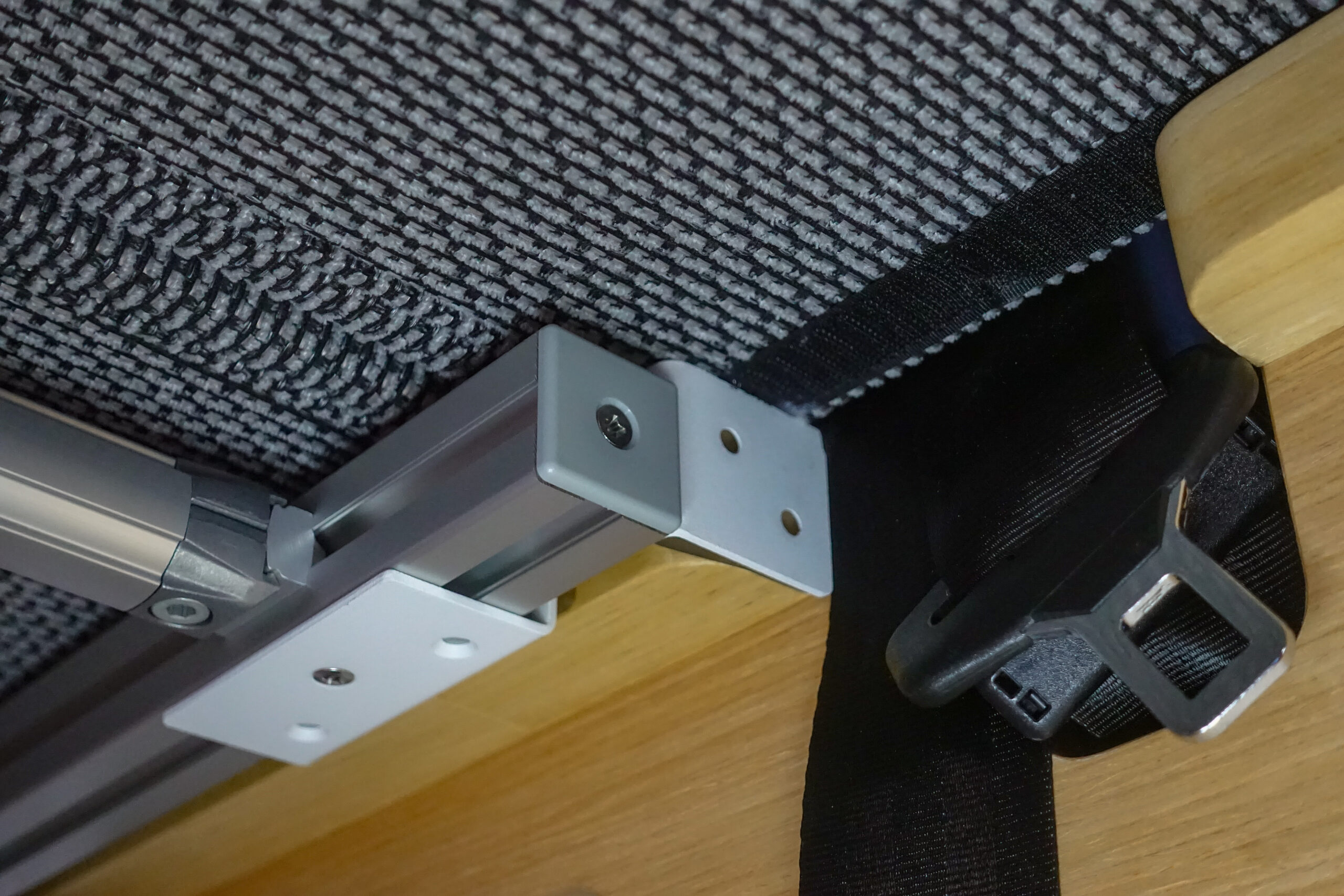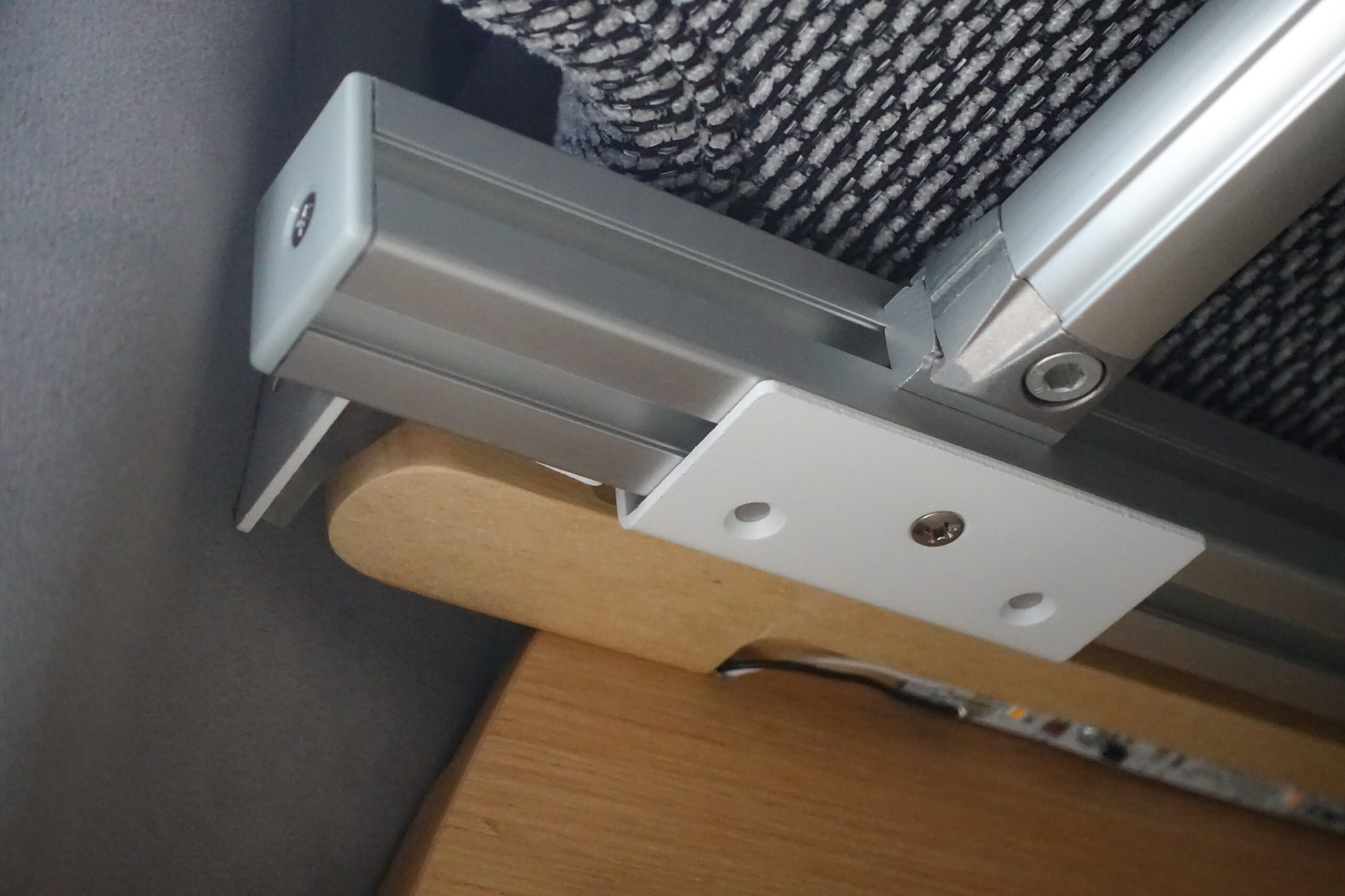 助手席側の上段ベッドの板を持ち上げながら、助手席側の「S-Fun 30 角フレーム」の引っ掛け金具を順番に差し込みます。