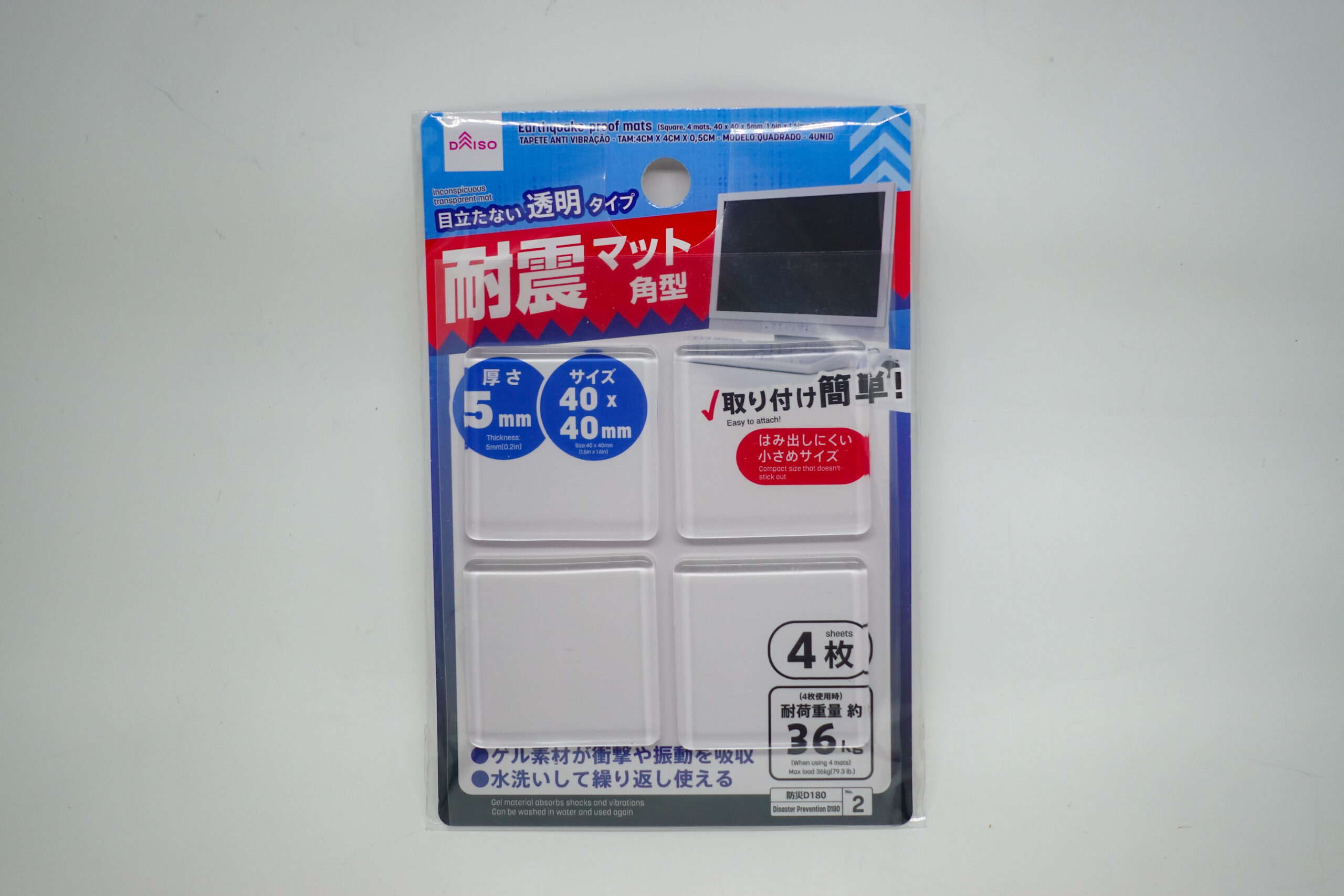 板受けの出っ張りに金具が当たる部分には、傷防止、グラつき防止のために、ダイソーの耐震マット角型を貼り付けておきます。
