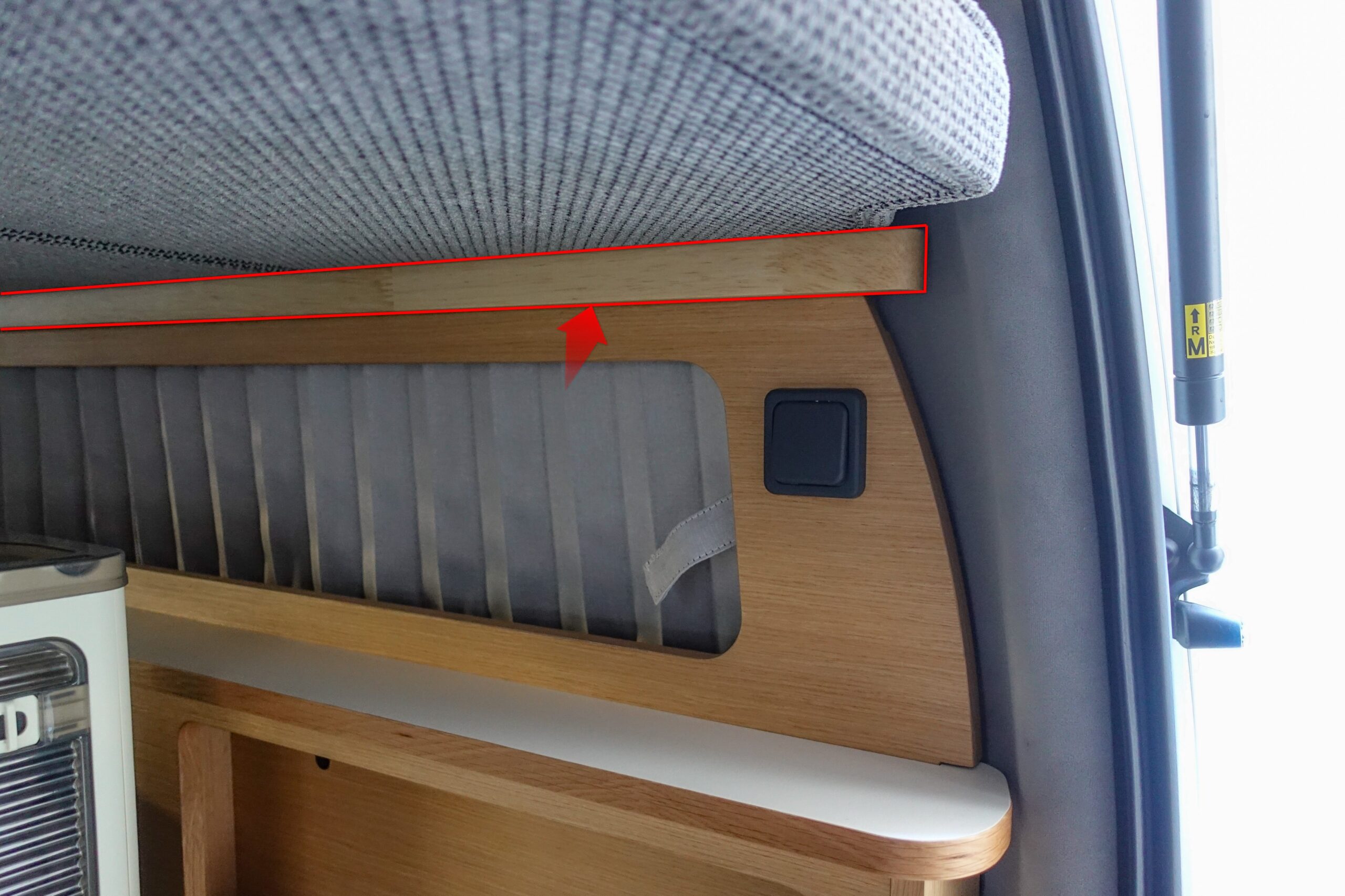「TOY'S BOX 470H」の両サイドの家具には、以下の写真の赤い矢印/囲みで示した、上段ベッドの板受けの出っ張りがあります。