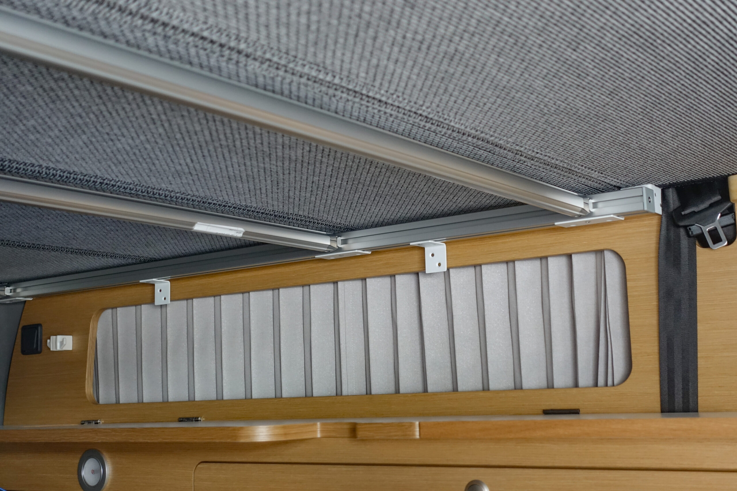助手席側の上段ベッドの板を持ち上げながら、助手席側の「S-Fun 30 角フレーム」の引っ掛け金具を順番に差し込みます。