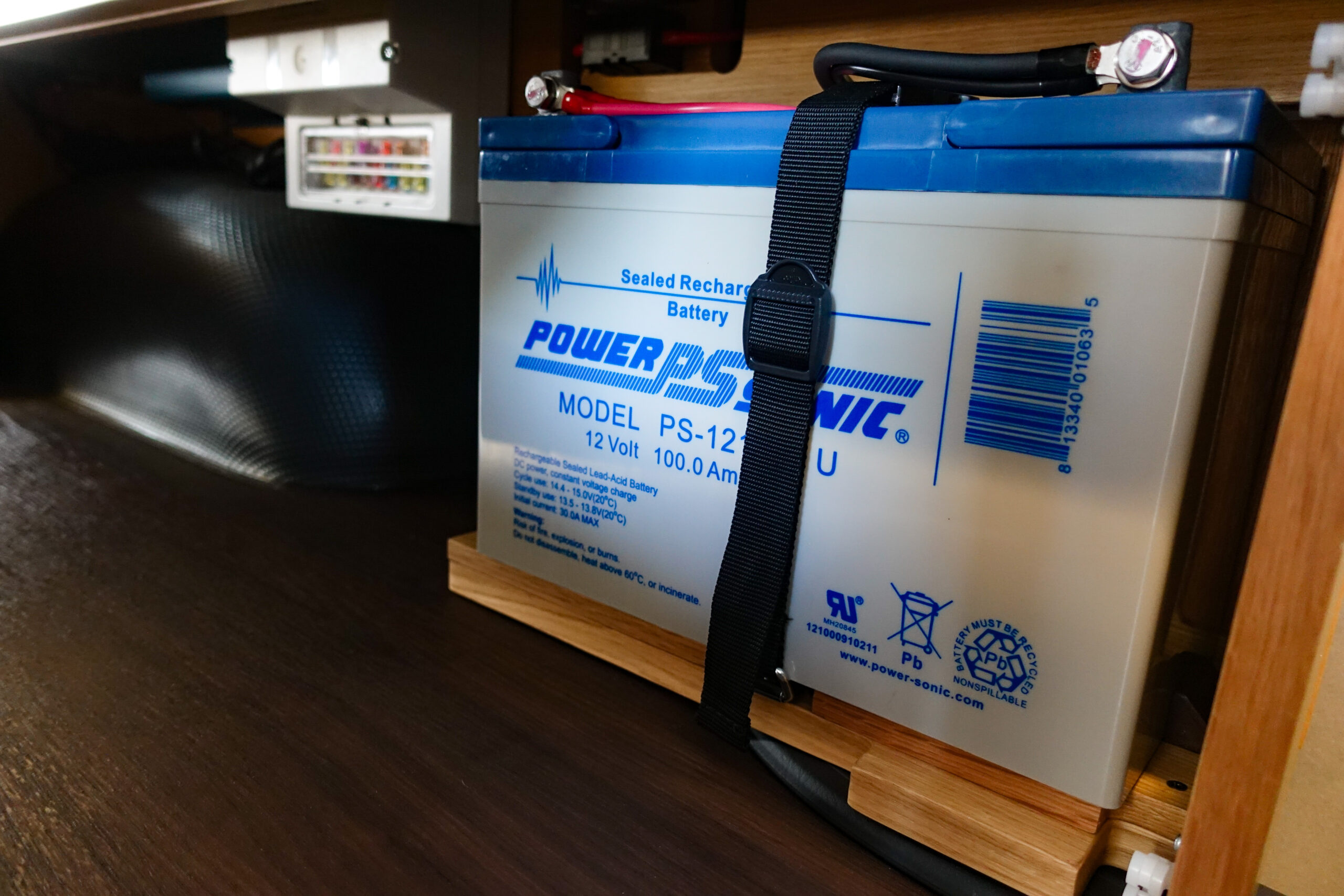 後は、サブバッテリーを元の場所に戻し、サブバッテリーが動かないように、固定用の黒いベルトを締め付けます。